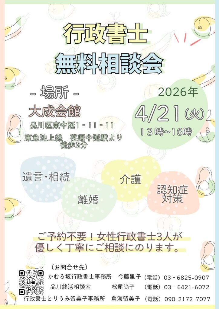 この度、2026年4月21日(火)に、品川区の「大成会館」におきまして、行政書士の無料相談会を開催する運びとなりました 。